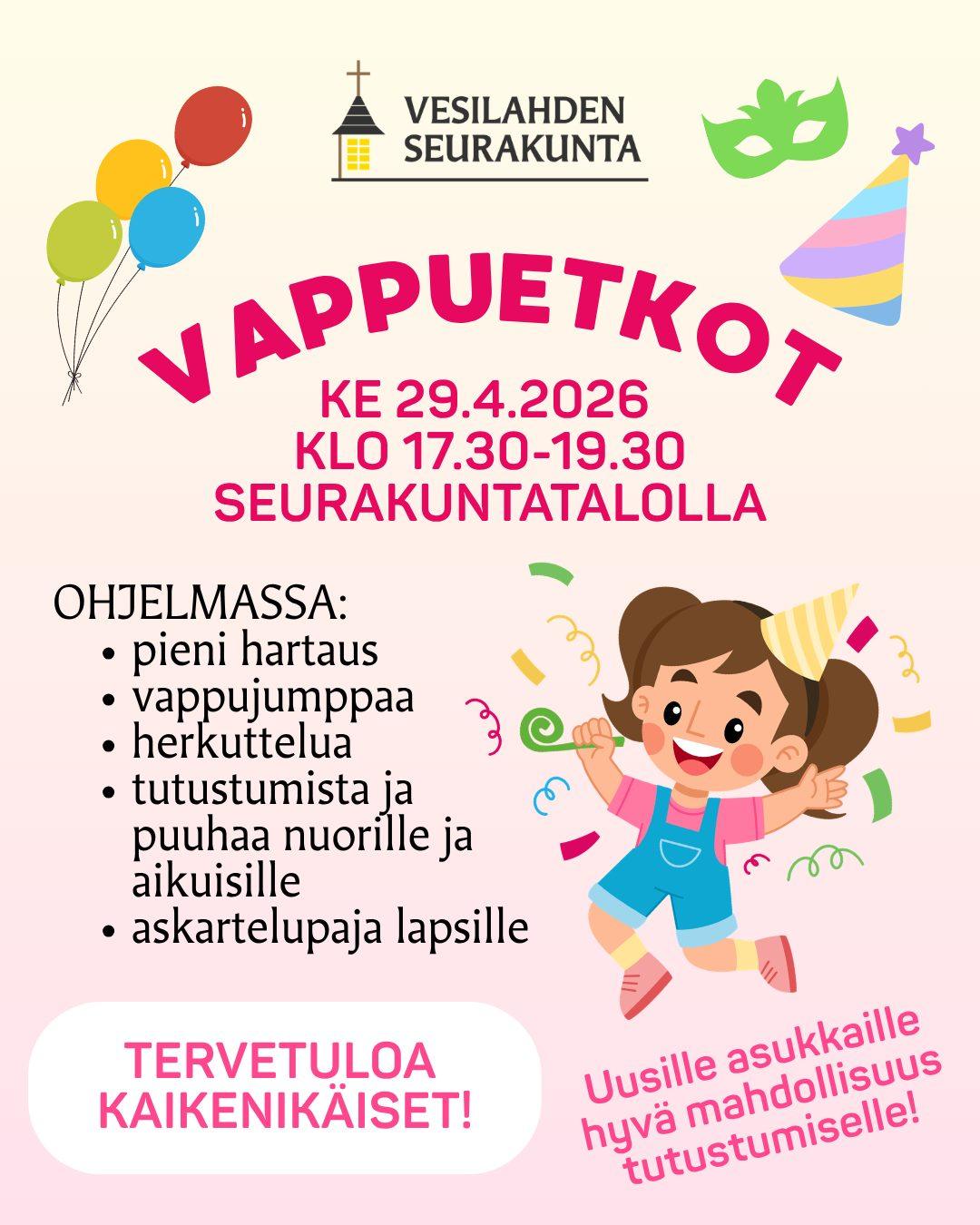 Vappuetkot kaikenikäisille! Vappuetkot keskiviikkona 29.4.2026 klo 17.30-19.30 seurakuntatalolla. OHJELMASSA: –...